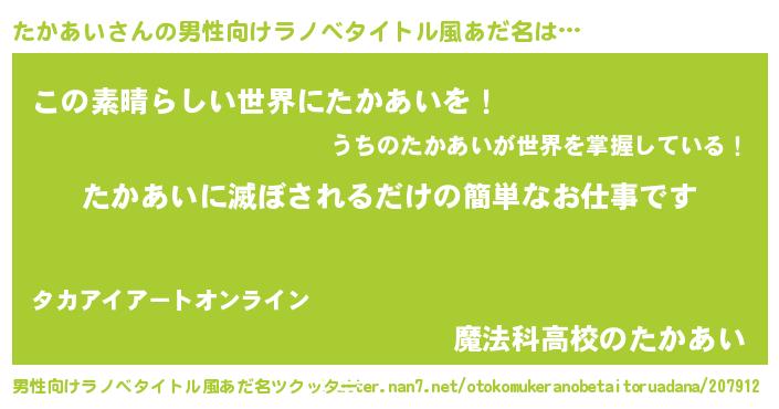 | 胡散臭い通販商品みたいなあだ名 | 『あなたにだけ特別に提供する世界で10本だけ現存している希少なブランデー…その名も「たかあい」』 |