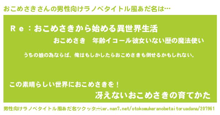 | 胡散臭い通販商品みたいなあだ名 | 『運命の人と巡り会える高級そうな絵画…その名も「おこめさき」』 |