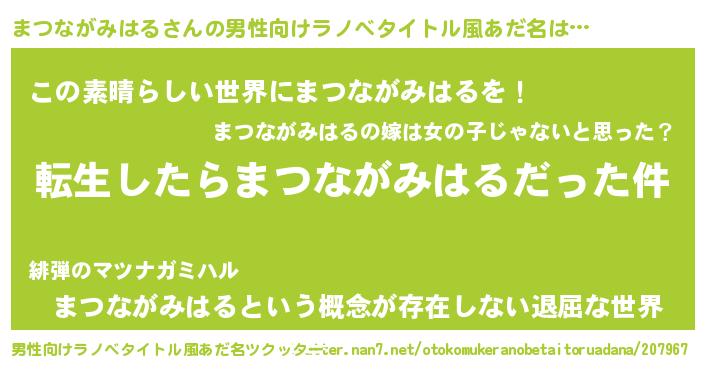 | 女子向けラノベタイトル風あだ名 | 『まつながみはるの玉の輿計画!』 |