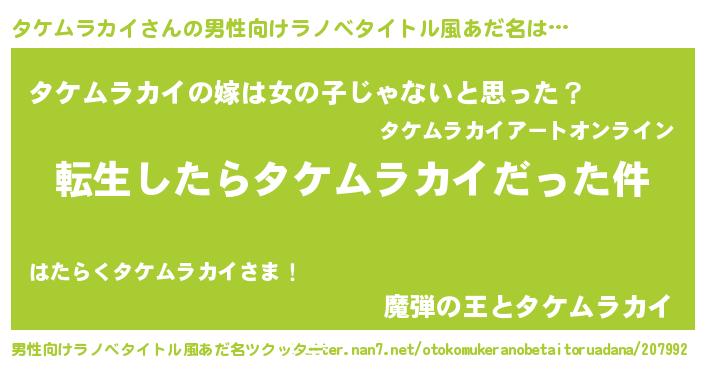 | 女子向けラノベタイトル風あだ名 | 『タケムラカイの玉の輿計画!』 |