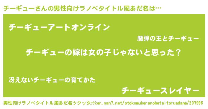| 女子向けラノベタイトル風あだ名 | 『チーギューの卵を拾いまして』 |