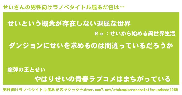 | 女子向けラノベタイトル風あだ名 | 『せいの卵を拾いまして』『闇のせい』 |