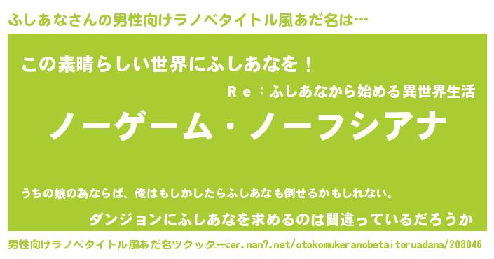 | 女子向けラノベタイトル風あだ名 | 『死神ふしあなの再婚』 |