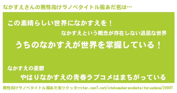 | 胡散臭い通販商品みたいなあだ名 | 『あなたにだけ特別に提供する世界で10本だけ現存している希少なブランデー…その名も「なかすえ」』 |