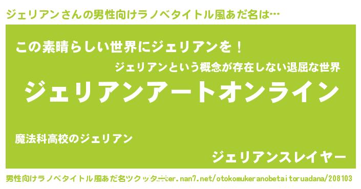 | 女子向けラノベタイトル風あだ名 | 『誰かこのジェリアンを説明してください! ~契約から始まるウェディング~』 |