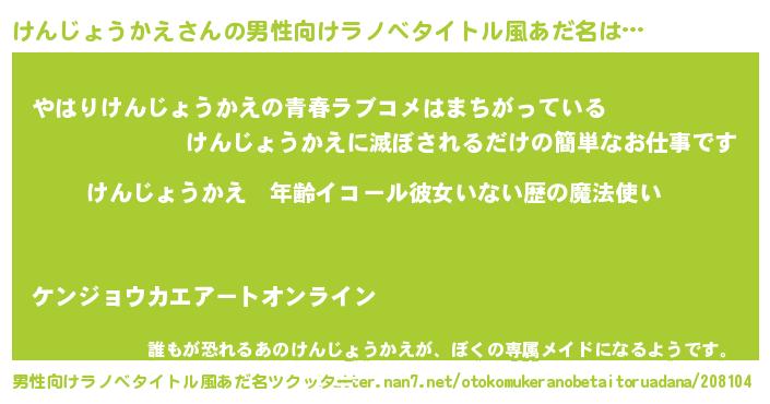 | 女子向けラノベタイトル風あだ名 | 『けんじょうかえの玉の輿計画!』 |