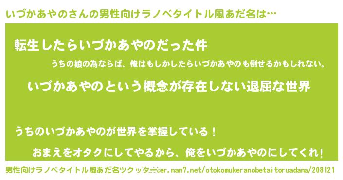 | 胡散臭い通販商品みたいなあだ名 | 『絶対に幸福をもたらす水素水…その名も「いづかあやの」』 |
