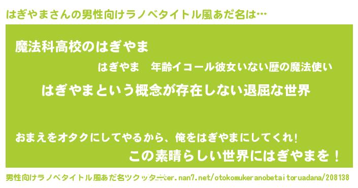 | 女子向けラノベタイトル風あだ名 | 『はぎやまの契約王妃』『はぎやま恋絵巻』 |