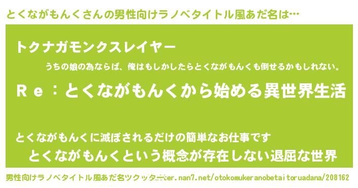 | 肩書あだ名 | 『とくながもんく閣下』 |