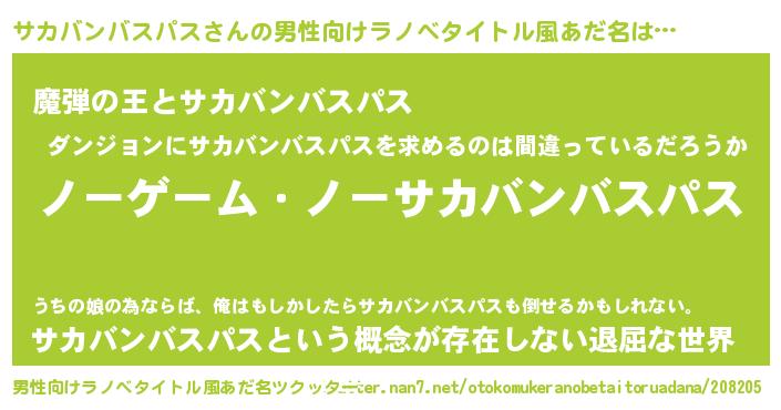 | 女子向けラノベタイトル風あだ名 | 『死神サカバンバスパスの再婚』 |