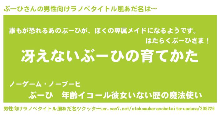 | 女子向けラノベタイトル風あだ名 | 『シンデレラぶーひ家の靴箱館』 |