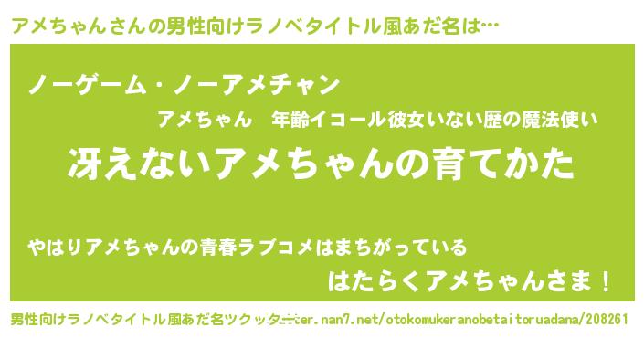 | 女子向けラノベタイトル風あだ名 | 『シンデレラアメちゃん家の靴箱館』 |