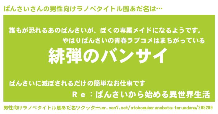 | ヘコむあだ名 | 『ばんさい(小並感)』『酢こんぶ』 |