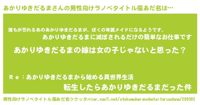 | 女子向けラノベタイトル風あだ名 | 『あかりゆきだるま様がみてる』 |