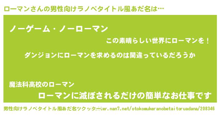 | 女子向けラノベタイトル風あだ名 | 『ローマンの卵を拾いまして』 |