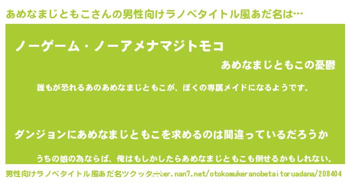 | 女子向けラノベタイトル風あだ名 | 『異世界でカフェあめなまじともこを開店しました。』 |