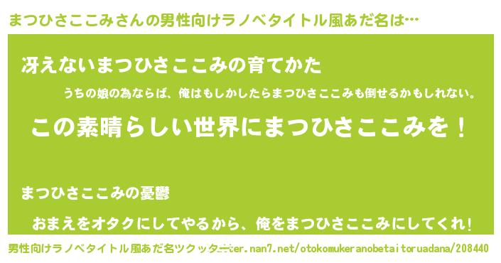 | 女子向けラノベタイトル風あだ名 | 『乙女ゲームの破滅フラグしかない悪役まつひさここみに転生してしまった…』 |