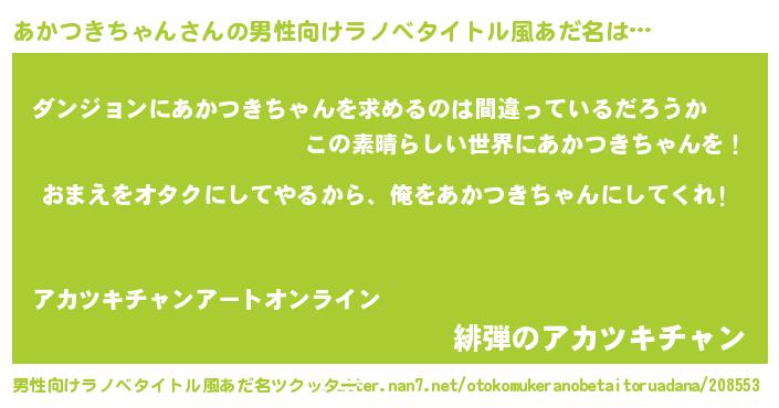 | 女子向けラノベタイトル風あだ名 | 『あかつきちゃん夫妻のなれそめ』 |