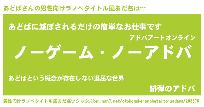 | 女子向けラノベタイトル風あだ名 | 『死神あどばの再婚』 |