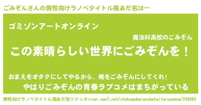 | 女子向けラノベタイトル風あだ名 | 『悪役ごみぞんに転生したようですが、知った事ではありません』 |