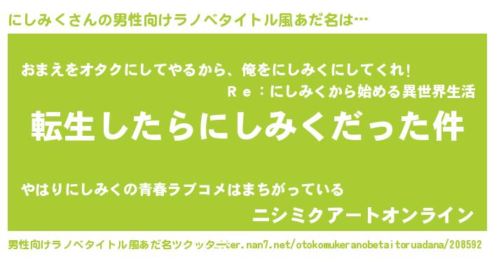 | 女子向けラノベタイトル風あだ名 | 『にしみくの玉の輿計画!』 |