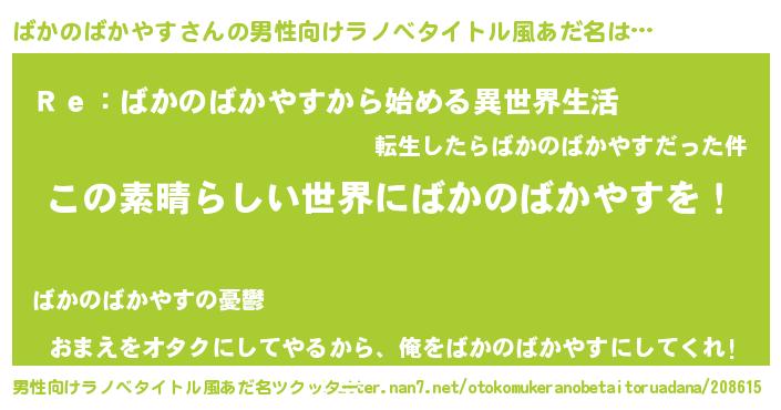 | 女子向けラノベタイトル風あだ名 | 『悪役ばかのばかやすに転生したようですが、知った事ではありません』 |
