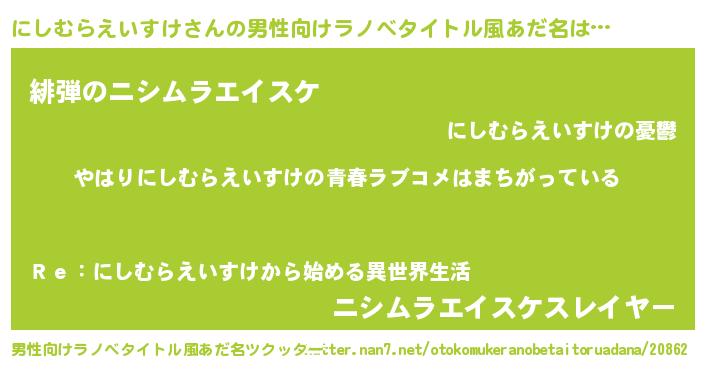 | 女子向けラノベタイトル風あだ名 | 『にしむらえいすけ伯爵の花嫁』 |