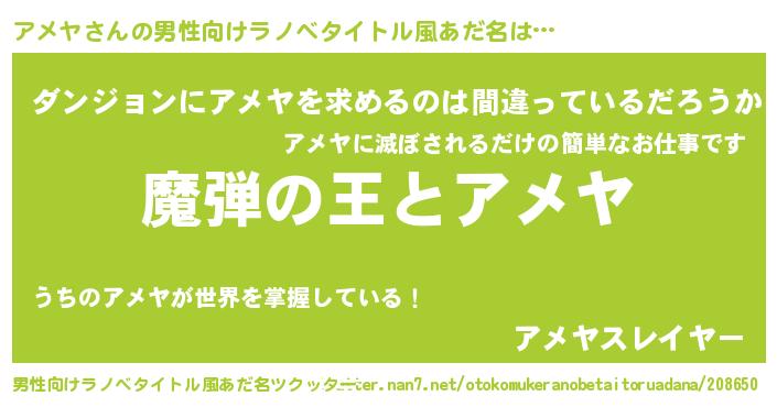 | 女子向けラノベタイトル風あだ名 | 『乙女ゲームの破滅フラグしかない悪役アメヤに転生してしまった…』 |