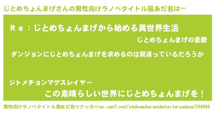 | 女子向けラノベタイトル風あだ名 | 『じとめちょんまげの卵を拾いまして』 |