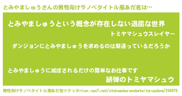| 女子向けラノベタイトル風あだ名 | 『とみやましゅうの卵を拾いまして』 |