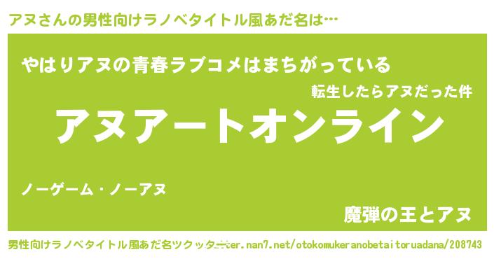 | 女子向けラノベタイトル風あだ名 | 『誰かこのアヌを説明してください! ~契約から始まるウェディング~』 |
