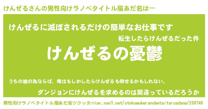 | 女子向けラノベタイトル風あだ名 | 『(仮)けんぜるのやんごとなき事情』 |