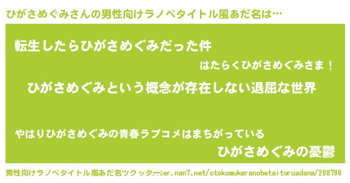| 女子向けラノベタイトル風あだ名 | 『異世界で失敗しない100のひがさめぐみ』 |