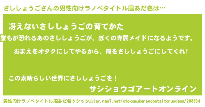 | 女子向けラノベタイトル風あだ名 | 『さししょうご夫妻のなれそめ』 |