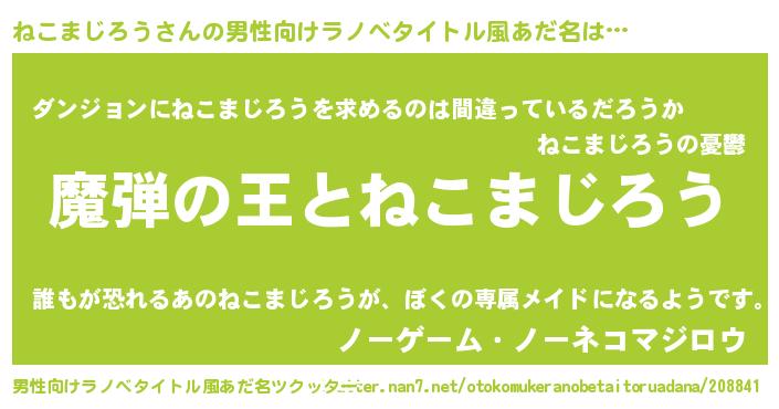 | 女子向けラノベタイトル風あだ名 | 『乙女ゲームの破滅フラグしかない悪役ねこまじろうに転生してしまった…』 |