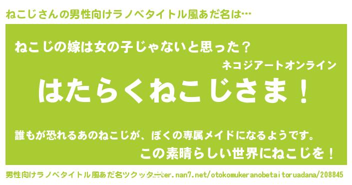 | 胡散臭い通販商品みたいなあだ名 | 『信頼と実績のサプリメント…その名も「ねこじ」』 |