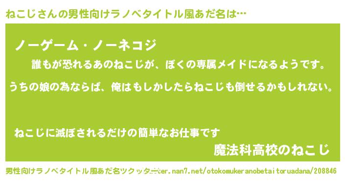 | 女子向けラノベタイトル風あだ名 | 『ねこじ伯爵の花嫁』『死神ねこじの再婚』 |