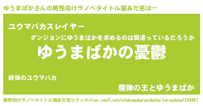| 女子向けラノベタイトル風あだ名 | 『(仮)ゆうまばかのやんごとなき事情』 |