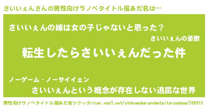 | 女子向けラノベタイトル風あだ名 | 『さいいぇんの玉の輿計画!』 |