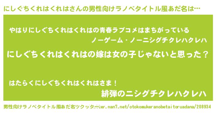 | 女子向けラノベタイトル風あだ名 | 『にしぐちくれはくれは様がみてる』 |