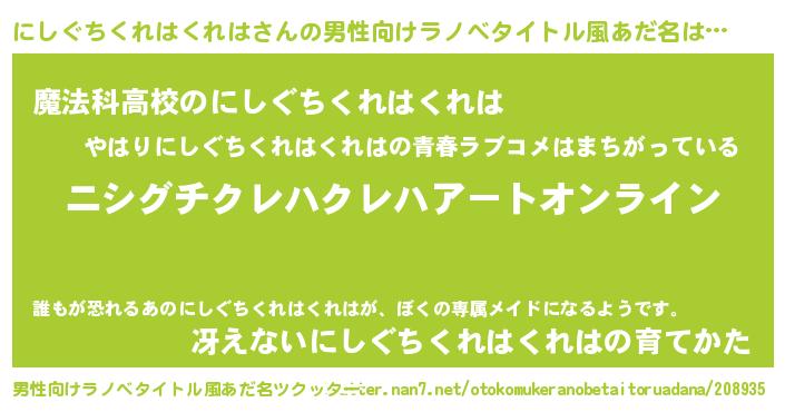 | 女子向けラノベタイトル風あだ名 | 『にしぐちくれはくれは姫と円卓の騎士』 |