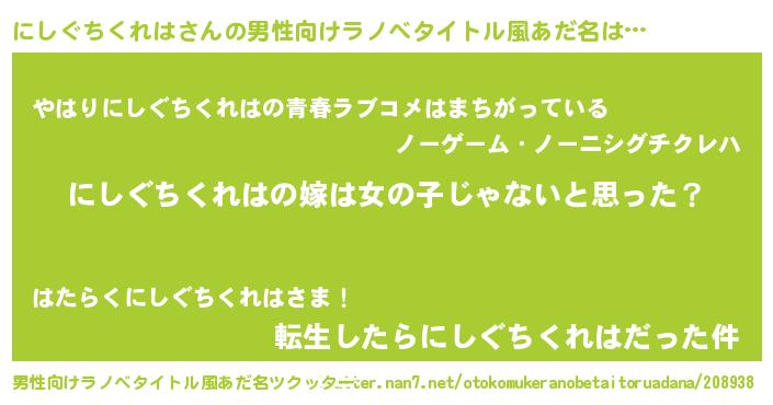 | 女子向けラノベタイトル風あだ名 | 『にしぐちくれはの卵を拾いまして』 |