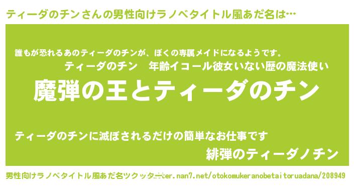 | 女子向けラノベタイトル風あだ名 | 『ティーダのチンが死なない童話 林檎のティーダのチンの診療簿』 |