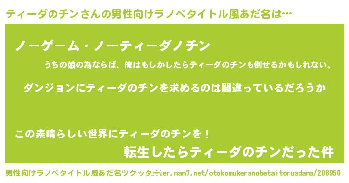 | 女子向けラノベタイトル風あだ名 | 『ティーダのチンの卵を拾いまして』 |