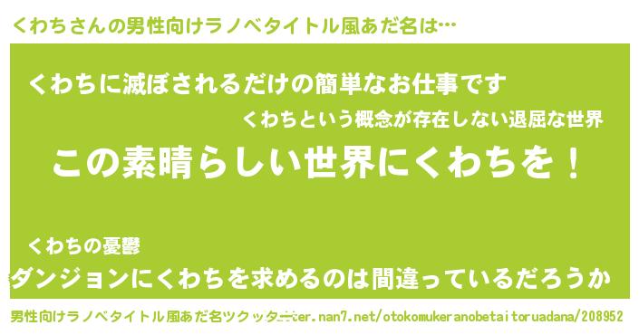 | 女子向けラノベタイトル風あだ名 | 『乙女ゲームの破滅フラグしかない悪役くわちに転生してしまった…』 |