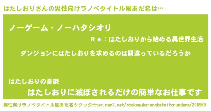 | 胡散臭い通販商品みたいなあだ名 | 『信頼と実績のサプリメント…その名も「はたしおり」』 |