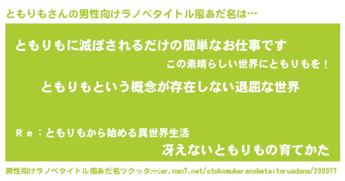 | 女子向けラノベタイトル風あだ名 | 『ともりもの契約王妃』『闇のともりも』 |