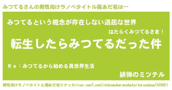 | 女子向けラノベタイトル風あだ名 | 『婚約破棄系悪役みつてるに転生したので、保身に走りました。』 |