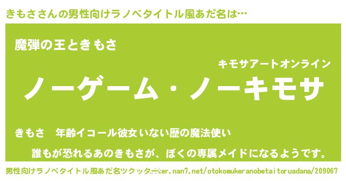 | 女子向けラノベタイトル風あだ名 | 『死神きもさの再婚』『きもさの契約王妃』 |