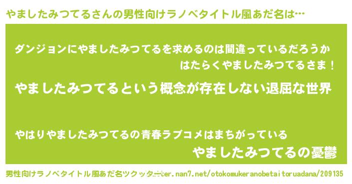 | 女子向けラノベタイトル風あだ名 | 『異世界で失敗しない100のやましたみつてる』 |